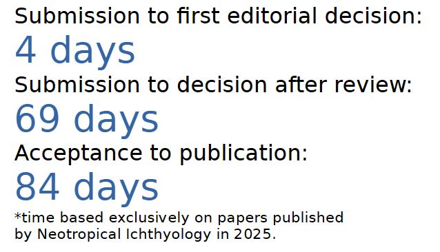 Production: Once accepted, the manuscript is revised by one or two Assistant Editors, who check for errors and adjust the format according to Neotropical Ichthyology’s style and standards. The revised manuscript is then forwarded to the Publishing Editor, who performs an additional review of the entire text, tables, figures, and supplementary files before sending all materials to the production team. Proof PDFs are returned to the Publishing Editor, who contacts the authors for corrections and final approval. After author approval, the final proof is reviewed by the Editor-in-Chief for a last round of corrections and adjustments. The approved version is then prepared by the production team, which generates the publishable PDF and XML files. These files are sent to the SciELO team (https://www.scielo.br/j/ni/), which publishes the article online and assigns the DOI upon release. On the same day, the article is also made available on the journal’s website (https://www.ni.bio.br/). Currently, the average time from submission to publication is approximately 180 days. However, our team is actively working to reduce this period by incorporating new editors and restructuring our editorial processes. Our goal is to shorten the timeline to approximately 120 days.