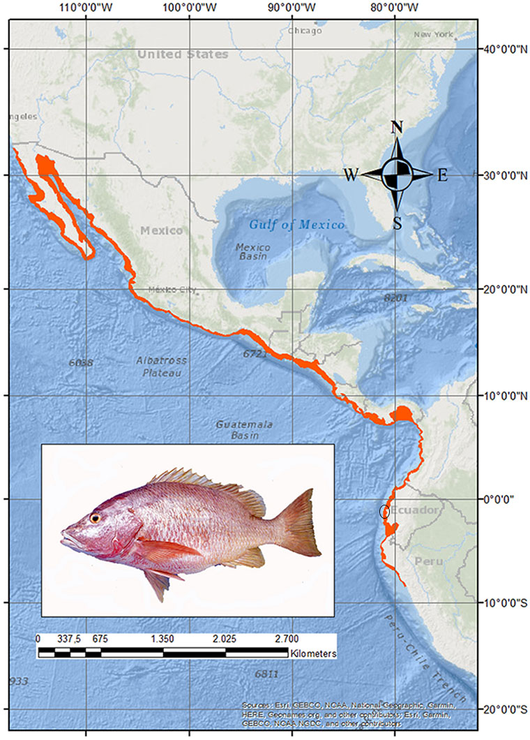 FIGURE 1| Lutjanus argentiventris geographical distribution (Map adapted from Robertson, Allen, 2015; Image represents a 645 mm TL individual).