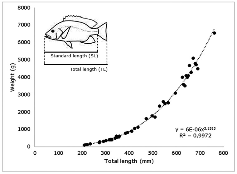 On the other hand, Karachle, Stergiou (2012) summarize the importance of length-weight models in three aspects of modern ecology studies: (1) use of length data as an estimation of biomass; (2) to ascertain the condition of the species; and (3) to compare the life history of different populations of the same species. In fisheries management, the weight and the size of fish are used to estimate population parameters, life history characteristics and to develop programs for the protection and management of the species (Castellanos-Galindo, Zapata-Padilla, 2019). This kind of information could be used to determine the minimum permissible lengths of capture and identification of suitable periods for a closed fishing season. The identification of age-classes and male to female ratios are relevant to evaluate the status of an exploited stock and to establish future harvest levels, and the relationship between fish-size and its life-history traits and habitats (Castellanos-Galindo, Zapata-Padilla, 2019; Froese, Pauly, 2019).