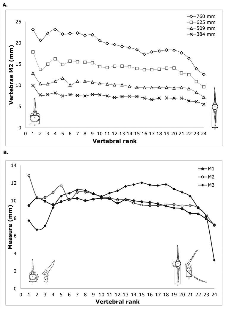 Desse et al. (1989) proposed to establish Global Rachidian Profiles (GRP) to identify the position of the vertebrae along the spine. This approach is really helpful in archaeological cases where the vertebrae are the most common element. At the same time, by knowing the height of an archaeological vertebra it is possible to estimate the size of an individual. To construct the GRP of L. argentiventris, four individuals with different sizes were selected, and measurements were taken on the caudal (diameters M1 and M2) and ventral faces (M3) of the vertebrae (Tab. 1, Fig. 2).