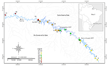 Sampling. The study was conducted along an approximately 600 km reach of the Upper Uruguai River where three hydroelectric dams have been constructed: Barra Grande (Upper stretch – completed in 2005), Machadinho (Middle stretch – completed in 2002), and Itá (Lower stretch – completed in 2000). Barra Grande has an area of 94 km2 and 90.6 days of the water residence time, while these values are 79 km2 and 54 days for Machadinho, and 141 km2 and 55 days for Itá. All of these reservoirs are formed by dams that are more than 100 m height. The spatial distribution of fish functional groups was investigated in eight locations, listed here from upstream to downstream: distant environment upstream from the uppermost dam [Distant Upstream – DU]; Barra Grande Reservoir [R1]; immediately downstream from Barra Grande Dam [Downstream Barra Grande DR1]; Machadinho Reservoir [R2]; immediately downstream from Machadinho Dam [Downstream Machadinho – DR2]; Itá Reservoir [R3]; immediately downstream from Itá Dam [Downstream Itá – DR3]; and distant downstream from the last dam [Distant Downstream – DD] (Fig. 1; Tab. 1). The environments Downstream R1, R2 and R3 were located approximately 250 m downstream from the dams, and the DD is a comparatively long and unimpeded stretch where several free-flowing tributaries join the river.