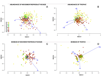 Data analysis. The CPUEN and CPUEB of the fourteen functional groups were log-transformed (log (x+1)) and nonmetric multidimensional scaling (NMDS) using the Bray-Curtis index was applied to evaluate dissimilarity in abundance (CPUEN) and biomass (CPUEB) of the functional groups between the sampled environments. Analysis were performed separately for trophic groups and movement/reproduction/size categories. The differences of functional assemblage structures (based on both trophic and movement/reproductive/size) among the eight locations were tested by Permutational Multivariate Analysis of Variance (PERMANOVA; Anderson, Walsh, 2013; Anderson, 2014), followed by post hoc tests performed with PERMANOVA pairwise comparisons, and Bonferroni method. The multivariate data were analyzed using the Bray-Curtis index generated from the transformed data with 9.999 permutations.