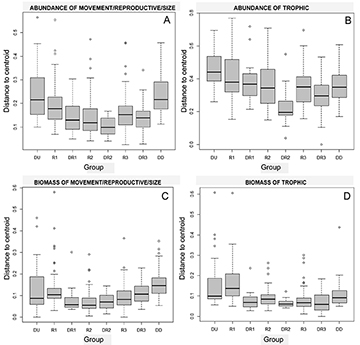 FIGURE 3 | Analysis of multivariate homogeneity of group dispersions (PERMIDISP) by betadisper boxplot, using the Bray-Curtis index, considering the abundance (CPUEN) of movement/reproductive/size (A) and trophic categories (B), and biomass (CPUEB) of movement/reproductive/size categories (C) and trophic categories (D). The data was based on sampling sites, and presented by environment groups: [DU, DD] = Sampling points away from the dams; [R1, R2, R3] = sampling points located in the reservoirs; [DR1, DR2, DR3] = locations downstream from dams. Greater distance to spatial median indicates larger dispersion and therefore a more diverse/heterogeneous environment. Box lower and upper endpoints represent the 25th and 75th quartiles, respectively. The horizontal bar and plus symbol inside each box represent median, excluding outliers, which are presented by open circles. See Tabs. 4 and 5 for P values from environments comparisons.