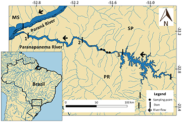 Study area. The Paranapanema River rises in the Atlantic Plateau of the “Serra de Paranapiacaba”, municipality of Capão Bonito, in the São Paulo State, Southeastern Brazil (Sampaio, 1944). It runs through approximately 930 km until it flows into the upper Paraná River (Sampaio, 1944). Extending from the Southeast of SP to the North of the Paraná State, about 330 km from its main channel define the borders between these Brazilian states (Maack, 1981). The lower Paranapanema River is the portion of the basin that begins after Salto Grande Falls (currently flooded by the Salto Grande Reservoir), covering in extension (from upstream to downstream) the reservoirs of Salto Grande, Canoas II, Canoas I, Capivara, Taquaruçu (our study area), and Rosana (Duke Energy, 2008).