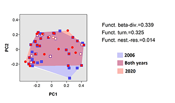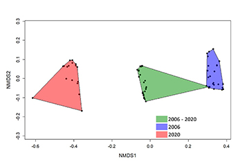 Statistical analyses. Non-metric multidimensional scaling (NMDS) ordination was employed to elucidate the differences in species composition between the time-periods (i.e., 2006 and 2020). Based on a matrix of distances (e.g., Jaccard method), we verified the degree of similarity between the periods following the species composition data. Thus, in our functional space, we plotted our species composition based on the first two dimensions of the NMDS (final stress level = 0.181). NMDS was run using the function “metaMDS” in the Vegan package (version 2.4–1; Oksanen et al., 2019). Also, to test for significant differences between the groupings of the NMDS, we utilized permutational analysis of variance (PERMANOVA) (Anderson, 2008) using 999 permutations and the function “adonis” in the Vegan package (Oksanen et al., 2019).