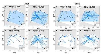 Functional indexes. The distribution of species and their abundance in the functional space characterize functional diversity (Mouillot et al., 2013). Here, we evaluated functional diversity based on four indexes: richness, evenness, divergence, and dispersion. Functional richness (FRic) was defined as the position occupied by species in the functional space (Villéger et al., 2008), while functional evenness (FEve) was based on the uniformity of their abundance in this same space (Mouillot et al., 2013). Functional divergence (FDiv) was calculated as the proportional abundance that was concentrated in species occupying the extremes of the functional space, in the same way as functional dispersion (FDis) was calculated by weighting the average distance of abundance for the extreme traits in this same space (Mouillot et al., 2013).