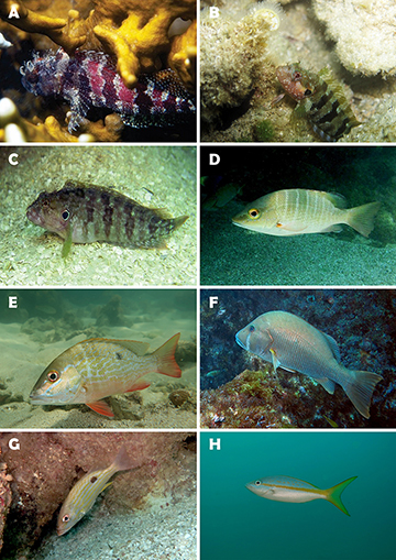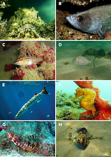 FIGURE 13 | Fish biodiversity from MPA Costa dos Corais. A. Scorpaena plumieri (~ 20 cm TL). B. Rypticus saponaceus (~ 22 cm TL). C. Serranus flaviventris (~ 8 cm TL). D. Calamus penna (~ 12 cm TL). E. Sphyraena barracuda (~ 60 cm TL). F. Hippocampus reidi (~ 8 cm TL). G. Synodus intermedius (~ 25 cm TL). H. Prionotus punctatus (~ 18 cm TL).