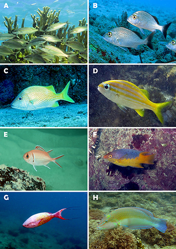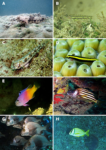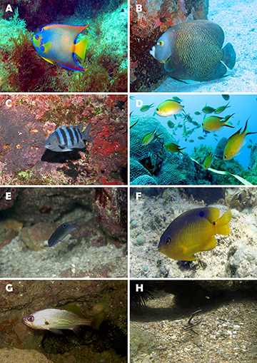 FIGURE 12 | Fish biodiversity from MPA Costa dos Corais. A. Holacanthus ciliaris (~ 30 cm TL). B. Pomacanthus paru (~ 25 cm TL). C. Abudefduf saxatilis (~ 10 cm TL). D. Azurina multilineata (~ 8 cm TL). E. Stegastes fuscus (~ 5 cm TL). F. Stegastes variabilis (~ 5 cm TL). G. Odontoscion dentex (~ 10 cm TL). H. Pareques acuminatus (~ 4 cm TL).
