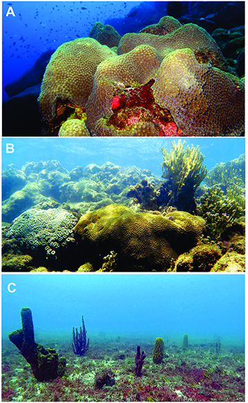 FIGURE 2 | Multiple habitats at MPA Costa dos Corais highlighting ecologically important areas for reef fishes biodiversity within the MPA. A. Deeper reefs (> 30 m depth) with predominance of the hard coral Montastraea cavernosaB. Shallow reefs (< 30 m depth) with dominance of hydrocoral Millepora alcicornis and Brazilian endemic brain coral Mussumila hartii. C. Sponge reefs with predominance of tube sponges from the genus Aplysina.
