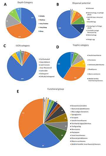 Regarding functional groups, the most abundant category was Mobile benthic invertivores/cleaners (115 species), followed by Macro-carnivores (87), Diurnal planktivores (26), Strict Piscivores/Sand invertivores (19 each) and General omnivores (18) (Fig. 3E).