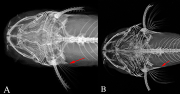 FIGURE 2 | Posterior cleithral process (red arrows) of A. Rhyacoglanis rapppydanielae, holotype, INPA 8060, 37.5 mm SL, and B. Rhyacoglanis seminiger, holotype, LIRP 12466, 74.2 mm SL.