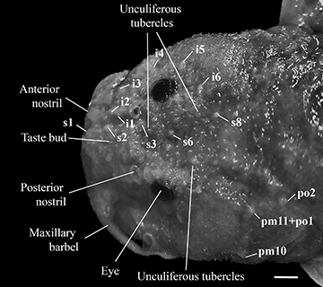 Head depressed, slightly longer than wide. Head anterior margin convex in dorsal view. Head dorsally covered by epidermal papillae (unculiferous tubercles larger than taste buds) (Fig. 4). Opercular membrane well developed; margin reaching pectoral-fin base. Mouth terminal, broad, more than one-half of HL. Upper jaw slightly longer than lower jaw. Lips thick, well developed primarily on lateral surface of jaws. Premaxillary tooth plate with posteriorly pointed projection. Anterior nostril immediately posterior of vertical through rictus. Eye small, superior, covered by skin, slightly anterior head half-length. Maxillary barbel short, not reaching the upper edge of operculum; base enlarged. Tip of adpressed maxillary barbel falling short of opercular margin. Adpressed inner mental barbel extending beyond base of outer mental barbel but falling short of barbel tip. Tip of adpressed outer mental barbel reaching margin of opercular membrane. Head laterosensory system pores conspicuous, six infraorbital (i1-i6), five supraorbital (S1-S3, S6, and S8), ten premaxillaries (pm1-pm10), one premaxillary-postorbital compound pore (pm11+po1), one postorbital (po2).