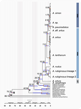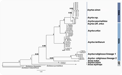 Our study presents the first phylogeny of the genus Acyrtus including all known representatives, revealing: 1) insights on the evolutionary history of the genus; 2) the current paraphyletic status of the genus; 3) the Brazilian Province species complex as a monophyletic group; 4) and the presence of undescribed and cryptic species. Although our phylogenetic inference is based on a single DNA marker, our conclusions are based on high statistical support.