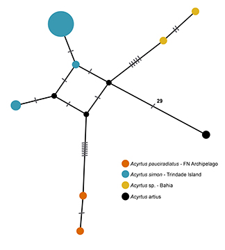 O gênero Acyrtus (Gobiesocidae) é representado por quatro espécies válidas encontradas no Atlântico ocidental e uma recentemente descrita do Pacífico oriental. Aqui descrevemos uma nova espécie endêmica da Ilha da Trindade, Brasil, e apresentamos a primeira inferência filogenética para o gênero incluindo todos os representantes. A nova espécie pode ser distinguida de suas congêneres por caracteres merísticos e morfométricos, bem como por diferenças genéticas. A espécie apresenta baixa diversidade genética, entretanto, diferentemente de outras espécies endêmicas da Ilha da Trindade, não mostra evidência de expansão populacional recente. A filogenia obtida revelou a existência de espécies crípticas e a natureza parafilética de Acyrtus, o qual inclui Arcos nudus (do Atlântico ocidental), e que é separado de Arcos erythrops (do Pacifico tropical oriental) por cerca de 20 milhões de anos. As três espécies encontradas no Brasil, incluindo uma ainda não descrita, formam um clado monofilético que colonizou o Atlântico Sul ocidental há cerca de 2,6 milhões de anos. Nosso estudo sugere que Arcos nudus deva ser alocado no gênero Acyrtus, e que as relações entre os gêneros Acyrtus (em maioria do Oceano Atlântico) e Arcos (do Oceano Pacífico) precisam ser estudadas em mais detalhes.