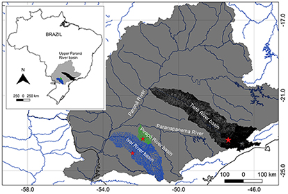 FIGURE 2| Map of Brazil showing the Upper Paraná River basin. Red stars represent Hypostomus tietensis populations, from Tietê River basin “type locality” (in black), from Pirapó River (in green), and from Do Campo River, tributary of Ivaí River basin (in blue).