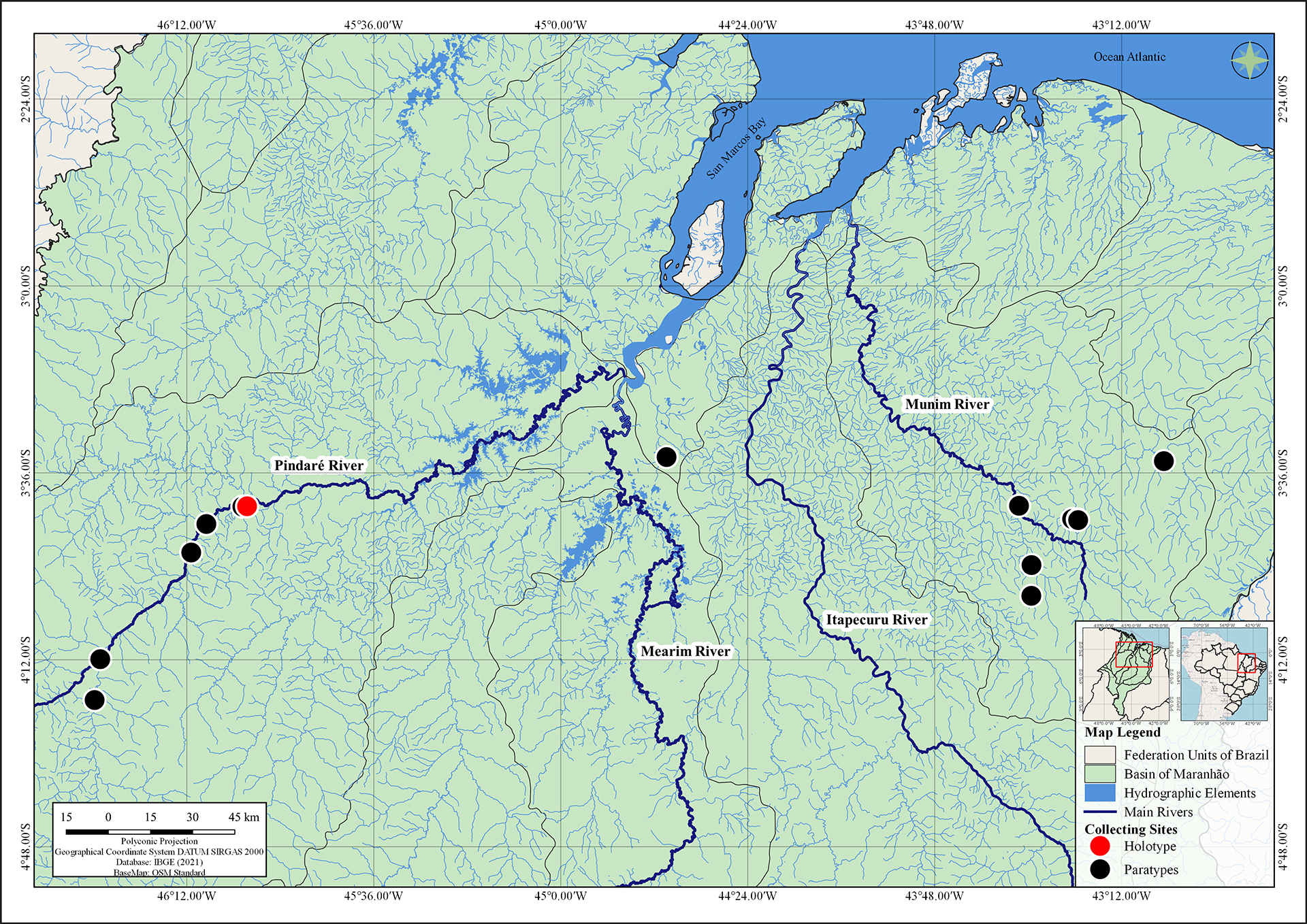 Taxon sampling, specimen collection, and preservation. Specimens were captured with a manual trail-net (2 m long × 1.8 m high; mesh size, 2 mm) and euthanized in a buffered solution of ethyl-3-amino-benzoat-methanesulfonate (MS–222) at a concentration of 250 mg/L until complete cessation of opercular movements, according to animal welfare laws and guidelines (Close et al.,1996; Leary et al.,2013). Specimens selected for morphological analysis were fixed in formalin for 10 days, after which they were preserved in 70% ethanol. Molecular data were obtained from specimens fixed and preserved in absolute ethanol. Specimens for morphological analysis are included in the lists of type and comparative material. Specimens for molecular approaches are listed in Tab. 1. Type material are deposited in the following ichthyological collections: Laboratório de Biologia e Genética de Peixes, Universidade Estadual Paulista Júlio de Mesquita Filho, Botucatu (LBP); Instituto de Biologia, Universidade Federal do Rio de Janeiro, Rio de Janeiro (UFRJ); Coleção Ictiologica do Centro de Ciências Agrárias e Ambientais da Universidade Federal do Maranhão, Chapadinha (CICCAA); and Coleção Ictiológica da Universidade Estadual do Maranhão, São Luís (CIUEMA).