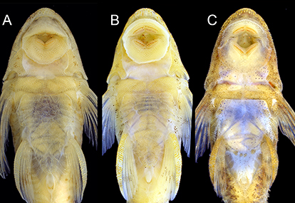 3a. Belly covered with middle abdominal plates between lateral abdominal plates (Figs. 10A,B); males with dorsal skin fold on first pelvic-fin ray (Fig. 2D); urogenital papilla normally developed (approximately same size of anal tube; Fig. 2B)…………………… 4