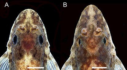 FIGURE 3| Snout shape and sexual dimorphism in Rhinotocinclus bristkii, ZUEC 16817. A. male: head wider at nostril level, nostril larger, internarial narrower, area between nostrils elevated; B. female: head narrower at nostril level, nostril smaller, internarial wider, area between nostrils not elevated. Scale bar = 2 mm.