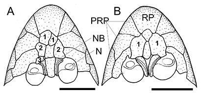 5b. Snout more broadly rounded (Fig. 11A); dark bars on body narrower and spaced (Fig. 7A); one plate between posterior border of rostral plate and nostril (Fig. 12B)…………………… 6