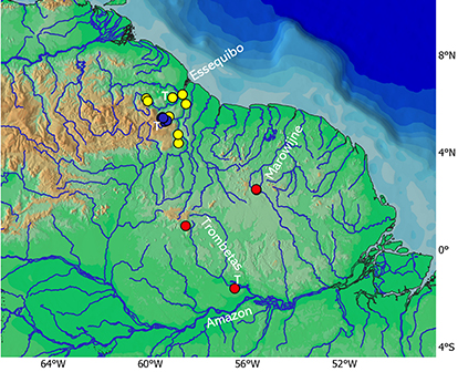 In the description of color, bar is used for transverse marks on body, band is used for transverse marks on fins, and stripe is used for longitudinal marks. In the species account, type-localities are written as in the original description, with occasional corrections or additions made between square brackets. Geographic descriptors are written in the language of the country of origin, to avoid translating error. Accordingly, we use “rio” for Brazilian localities, “Río” for localities in Spanish speaking countries, and “River” for Guyana. For simplicity, we also use English for the geographic descriptors in Suriname. Specimens examined belong to fish collections whose acronyms are given in Sabaj (2020). In the lists of examined material, museum abbreviation and catalog number come first, followed by the number of specimens and locality data. For the new species, type-material includes catalog number followed by the number and SL range of specimens in that lot, the number and SL range of specimens measured for the morphometric comparisons, in parentheses, locality, date of collection, and collectors. Conservation status of the new species were assessed following the categories and criteria of the International Union for Conservation of Nature (IUCN Standards and Petitions Subcommittee, 2019). Distribution information for all species was compiled and managed with Google Earth Pro and distribution maps were generated with the software QGis, following the tutorial presented by Calegari et al. (2016).