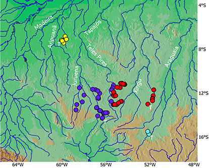 Geographical distribution. Rhinotocinclus jumaorum occurs in the rio Juma, a small tributary to the rio Aripuanã and the rio Acari, a tributary to the rio Canumã, rio Madeira basin, in state of Amazonas, Brazil (Fig. 43).