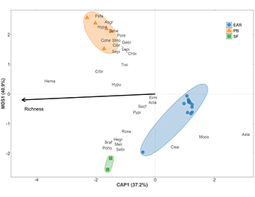 Richness, abundance, and Shannon diversity were included as variables to find the best explanatory model for fish assemblage. Modeling was conducted via stepwise selection by the Akaike information criterion (AIC) until the minimum adequate model was obtained (Crawley, 2013). The explanatory variables ‘abundance’ and ‘Shannon diversity’ were excluded from analysis due to collinearity issues, leaving ‘richness’ as the only explanatory variable in the final model. Data was analyzed using a Canonical Analysis of Principal coordinates (CAP). The CAP allows the detection of linear relationships on (dis)similarities matrices, highlighting the relative contribution of predictor variables to the fish assemblages (Legendre, Anderson, 1999). The dissimilarity based on the matrix obtained by Bray-Curtis distance was tested using PERMANOVA for explanatory variables, with 999 permutations.