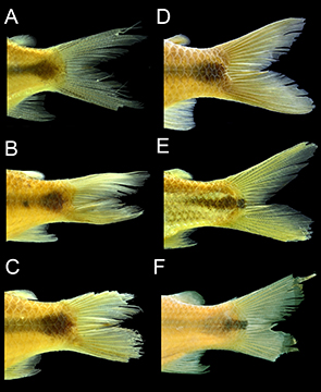 FIGURE 2| Caudal peduncle and fin of Cyphocharax species: A. C. tamuya, MZUSP 108117, paratype; B. C. voga, MZUSP 39782; C. C. santacatarinae, MZUSP 58659; D. C. gilbert, MZUSP26861; E. C. naegelii, MZUSP 207752; F. C. platanus, MZUSP 45858.