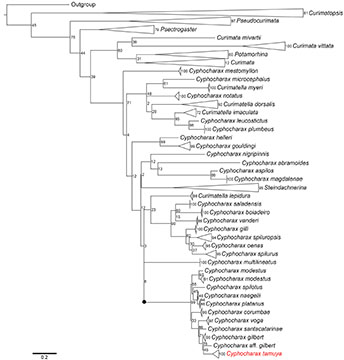 Vari (1989) hypothesized the Cyphocharax gilbert group as including C. gilbert, C. modestus, C. santacatarinae, and C. voga, based on the shared presence of a round caudal peduncle blotch. Vari also suggested C. naegelii and C. platanus as close relatives of the C. gilbert group based on overall similarity. Recently, Melo et al. (2018) corroborated the C. gilbert group as a well-supported monophyletic clade within Curimatidae, also including C. corumbae, C. naegelii, C. platanus,and C. spilotus, in agreement with the morphological hypothesis of Vari (1989). The maximum likelihood analysis presented herein recovered a similar topology to that proposed by Melo et al. (2018). Despite the methodological limitations of single locus analyses in phylogenetic inferences (e.g., Hajibabaei et al., 2006, 2007), it is important to note that the present analysis supports the assignment of C. tamuya to the C. gilbert clade and adds molecular evidence to the morphological similarity to support the hypothesis of a close relationship between these species.