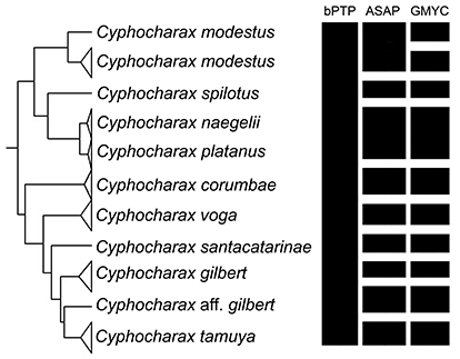Molecular species delimitation. The molecular dataset included 210 sequences of 657 base pairs in length. Stop codons, deletions or insertions were not observed in any sequences. In the matrix 386 positions were conserved and 271 were variable, with base compositions of 23% adenine, 27.9% cytosine, 30.1% thymine and 18.4% of guanine. The data were not saturated as evaluated via the Iss.c value. The maximum likelihood tree from RAxML shows the same topology obtained in the ultrametric tree from BEAST and the three delimitation analyses (Fig. 4). The bPTP approach delimited 95 lineages, and Cyphocharax tamuya was grouped with the remaining species composing the C. gilbert clade of Melo et al. (2018) with a posterior probability of 0.926 (Fig. 5). In contrast, the results from the ASAP analysis showed a low asap score of 4.00 with a p-value 0.0063, and delimited 101 species from the total dataset (six more than did bPTP). The ASAP analysis delimited all species belonging to the C. gilbert clade as unique lineages except for C. naegelii and C. platanus which were grouped in a single lineage. The best fitting model in the GMYC analysis received a likelihood score of 1471.86 in comparison with the null model of 1435.10. The GMYC analysis identified a total of 106 entities with a confidence interval of 103-111 and a threshold time of -0.007. This analysis recognized the new species as a differentiated entity, again grouped C. naegelii and C. platanus in the same lineage, and recovered two distinct lineages within C. modesus. Regarding the genetic distances from a sub-matrix containing the COI sequences from the all known species in C. gilbert clade (Tab. 3), the overall mean distance among species was 3%. The lowest genetic distance between C. tamuya and any other known species was 2.5% (from C. gilbert), followed by 3% from C. santacatarinae, and 3.2% from C. aff. gilbert.