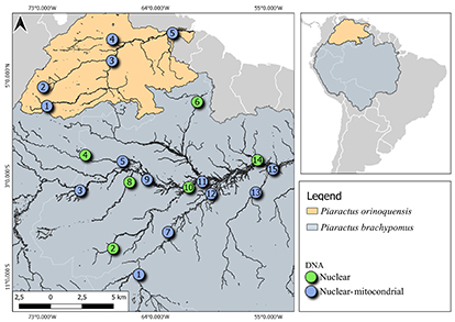 The species Piaractus brachypomus (Cuvier, 1818) and Piaractus orinoquensis Escobar L., Ota, Machado-Allison, Andrade-López, Farias & Hrbek, 2019 are the second largest fishes of the order Characiformes with maximum sizes of approximately 88 cm TL, after Colossoma macropomum (Cuvier, 1816) (max. of 108 cm TL) (Ortí et al., 2008; Froese, Pauly, 2022). Both species of Piaractus were considered a single species for more than two centuries. Escobar L et al. (2019) differentiated P. orinoquensis from P. brachypomus, the first from the Orinoco basin and the second from the Amazon basin, where they are widely distributed, occupying lacustrine and fluvial environments of the white and clear waters. Both species migrate with schools moving between 100 to 150km for reproductive, food and dispersal purposes at different seasons of the year (Goulding, 1979; Loubens, Panfili, 2001; Novoa, 2002; Barthem, Fabré, 2004; Barthem, Goulding, 2007; Usma et al., 2009; Van Damme et al., 2011). In each basin the species provide important ecosystem services. They are important to the local and regional economies where they are a fishing and aquaculture resource being caught and reared for human consumption; additionally, due to their trophic omnivore characteristics (with a tendency to frugivory), they play an important role in the ecosystem as seed dispersers (Novoa, 2002; Barthem, Fabré, 2004; Carvajal-Vallejos, Zeballos-Fernández, 2011; Lasso et al., 2011; Lasso, Sanchez-Duarte, 2011). Given their economic importance, these species have suffered from severe overfishing, and also have been negatively impacted by other anthropic activities that degrade their natural environments (Goulding, 1979; CCI, 2008). Although there are national fishery management policies focused on species protection in each basin where they occur (Acuerdos No 008/1997, No 006/1998 INPA y Resolución 1924/2005 AUNAP in Colombia; Resolución 003/2002 INAPESCA in Venezuela; Portaria No 48/2007 IBAMA in Brazil and Resolución Ministerial No 147/2001 Ministerio de Producción in Perú), these policies are ambiguous, ineffective and fail in their conservation aims. Generally, as policy actions are based on the differences in phenotypic characteristics, abundance and mean size indicators associated with the geographic region these species occupy, all policies assume that the species comprise one homogeneous population (Batista et al., 2012). This management strategy is advantageous for the fishing economy in the short-term, given its easy application; however, in the long-term, it can cause the extinction of natural populations because the structure of biological units is ignored (Begg, Waldman, 1999).