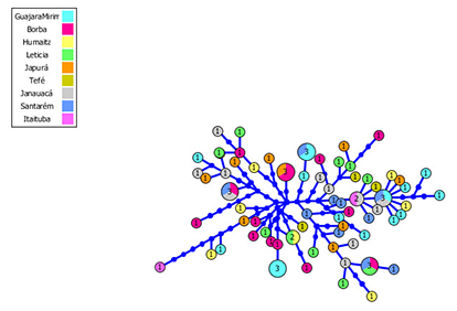 Mitochondrial data of 84 individuals from nine sampled localities of the Amazon basin were analyzed. The sequences were 797 base pairs in size, revealing 70 haplotypes: 8 (11.4%) between two or more localities. Haplotypic diversity in all the localities was Ĥ=1.000, while the nucleotide diversity ranged from ᴫ=0.0070 (Santarém) to ᴫ=0.0113 (Itaituba) with an average of 0.0092 (Tab. 2). The haplotype network showed little clustering of individuals from the same localities and regions, implying a high degree of gene sharing (Fig. 2).