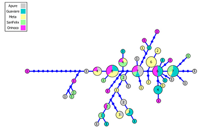 The mitochondrial DNA of 92 individuals from five localities was sequenced and analyzed. The sequences were 509 base pairs; 42 haplotypes were identified of which 11 were shared (26.2%). Haplotypic diversity showed high values of 0.012 and 0.011 (Puerto Carreño and Apure, respectively) and values of 0.009 (Meta and Guaviare) (Tab. 3). The haplotype network also showed low clustering of individuals from different localities although it appeared more extensive than in P. brachypomus (Fig. 3).