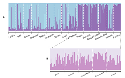 FIGURE 4| A. Barplots created from Structure representing assignments of genotypes to each local population for Piaractus brachypomus, the blue color cluster represents individuals related to the Amazon sedimentary basin and the purple color cluster represents individuals related to the crystalline shields of the Amazon basin. B. Barplots hierarchical from crystalline shields of the Amazon basin.