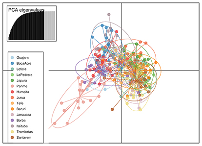 Genetic diversity. Piaractus brachypomus: in the Amazon basin a total of 300 individuals, sampled from 15 localities, were analyzed with seven microsatellite loci, obtaining a total of 79 alleles with 13 alleles on average per locus. Genetic diversity calculated as allelic richness varied from A=5.2 (Boca do Acre) to A=7.8 (Japurá) with an average of A=6.5 alleles per locus; the expected heterozygosity varied from He=0.62 (Parimé) to He=0.79 (Itaitubá) with an average of He=0.72, while the observed heterozygosity ranged from Ho=0.55 (Boca do Acre) to Ho=0.80 (Japurá) with an average of Ho=0.67. Significant deviations from H&W after the Bonferroni correction were observed in three loci at six of the 15 sampled localities: Juruá and Itaituba (Cm1G7), Beruri, Humaitá, and Borba (Cm1F7) and Janauacá (Pme21), so these loci from these localities were not included in the analyses of population structure. The inbreeding coefficient estimates were significant in three of the 15 localities: Humaitá (FIS=0.210), Borba (FIS=0.149) and Santarém (FIS=0.153) (Tab. 2).