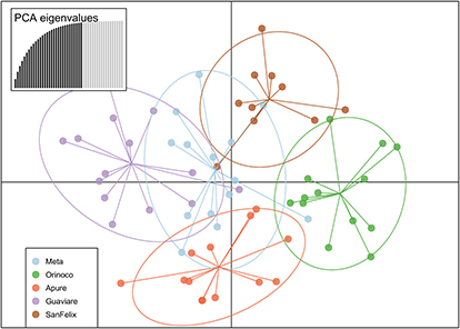 In P. orinoquensis, the “panmixia” was rejected because the population revealed a discrete structure. Based on nDNA data, AMOVA analysis estimated FST=0.044 (P<0.005), which categorizes the population with low structuring. The pairwise FST values showed a significant difference between San Felix with Meta (FST=0.097), Apure (FST=0.063) and Guaviare (FST=0.087); and between Puerto Carreño with Guaviare (FST=0.058) after Bonferroni correction (Tab. S10). The Bayesian analysis detected a single population unit (K=1) (Fig. S11), but DAPC uses 40 retained PC and 3 discriminant functions and estimated three clusters identified with low support (Fig. S12) while the characterization showed grouping of all localities (Fig. 7). The Mantel test showed lack of significant association between genetic distances and geographic distances (r=0.365, p=0.1961).