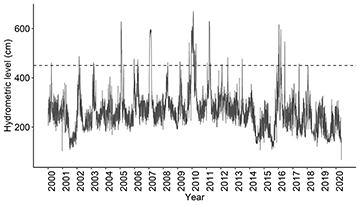FIGURE 2| Daily variation in the level of the Paraná River between 2000 and 2020 (provided by the Agência Nacional de Águas e Saneamento Básico – ANA). The horizontal line represents the 4.5 m level when the Paraná River overflows.