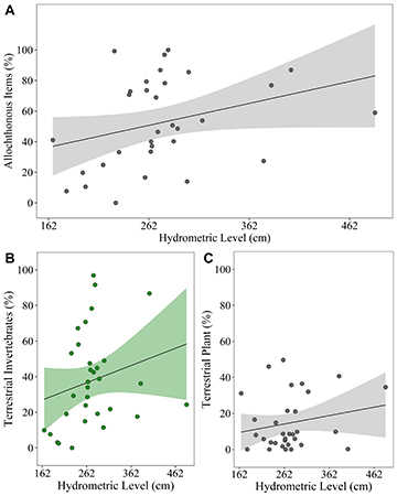 FIGURE 3| A. Relationship between the hydrometric level and the consumption of all allochthonous items; B. The consumption of terrestrial invertebrates; C. And the consumption of terrestrial plants for Trachelyopterus galeatus. The green graphs indicate a significant positive influence of the variable as a function of hydrometric level, while grayscale graphs indicate a non-significance.