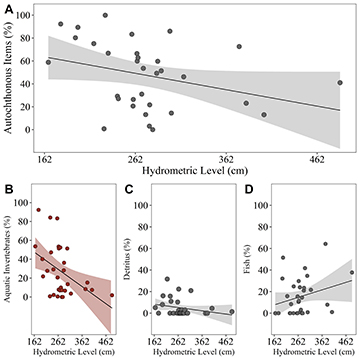 FIGURE 4| A. Relationship between the hydrometric level and the consumption of all autochthonous items; B. The consumption of aquatic invertebrates; C. The consumption of detritus; D. And the consumption of fish for Trachelyopterus galeatus. Red graphs indicate a significant negative influence of the variable as a function of hydrometric level, while grayscale graphs indicate a non-significance.