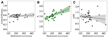 FIGURE 5| A. Relationship between the hydrometric level and the trophic niche breadth; B. Body condition; C. And the feeding activity of Trachelyopterus galeatus. The green graphs indicate a significant positive influence of the variable as a function of hydrometric level, while grayscale graphs indicate a non-significance.