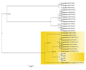 DNA barcode analysis. The Kimura 2-parameters genetic distance (K2P) between Rhyacoglanis varii and its congeners ranged from 1.9% (R. paranensis) to 3.4% (R. annulatus), with low intraspecific variation (Tab. 3). Based on COI gene sequences, species delimitation methods identified 7 MOTUs, corroborating R. varii as a new species. GMYC results indicated seven species with a confidence interval of 5 to 8 species; the maximum likelihood of the null model = 169.5058, the maximum likelihood of the GMYC model = 175.6366, and the threshold time = -0.0034. ABGD analysis resulted in 7 partitions where partition one (maximum previous distance p = 0.001) indicated 7 MOTUs. ASAP analysis retrieved nine partitions, with the lowest scoring partition (2.5) finding 7 MOTUs. The maximum likelihood solution of bPTP delimited 7 MOTUs and suggested a clear separation between the analyzed species. In the Bayesian inference analysis, R. varii was closely related to R. paranensis, and R. annulatus was the sister group of these two species. Rhyacoglanis sp. from the upper rio Araguaia basin (Fig. 9) was the basal species of the clade and was not closely related to R. varii. All Rhyacoglanis species clustered in a clade with high posterior probability support (Fig. 10), corroborating the monophyly of the genus. Pseudopimelodus and Cruciglanis were more closely related to each other than to Rhyacoglanis.