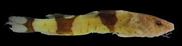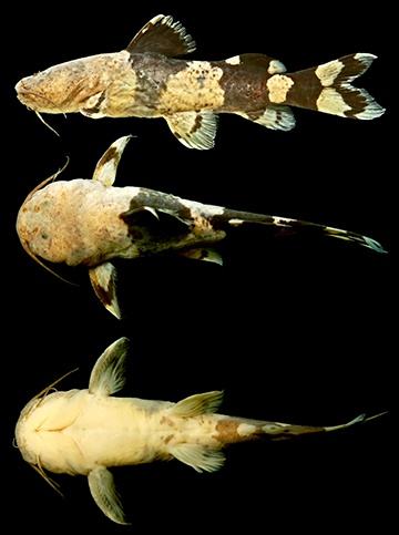 Coloration in life. Head dorsal region reddish-brown, lateral region with yellowish-brown spot, peppered with dark brown spots of about pupil size. Maxillary barbel base light-brown, grayish posteriorly. Eye gray. Trunk and caudal peduncle ground color light yellowish-brown, with three large black vertical bars (subdorsal, subadipose, and caudal peduncle), peppered with dark brown spots of eye diameter size. Subdorsal bar triangular; attenuated ventrally; subadipose bar trapezoidal; caudal peduncle bar vertically rectangular. Pectoral fin hyaline, reddish-brown, with dark brown band crossing middle of rays. Dorsal fin about 3/4 black, with distinct reddish-brown distal margin. Pelvic fin hyaline, reddish-brown, with dark brown spots crossing middle of rays. Adipose fin black with light brown spots on anterior and posterior regions, respectively. Anal fin light brown with dark brown band across middle of rays. Caudal fin hyaline, light brown, with 3-shaped black band on posterior half; distal margin hyaline (Fig. 5)