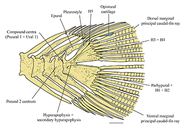 FIGURE 3| Rhyacoglanis varii caudal-fin skeleton, paratype, MZUEL 6039, 53.5 mm SL. Bones in yellow ocher and cartilage in blue. H1 to H5 = hypurals 1 to 5. Scale bar = 1.0 mm.