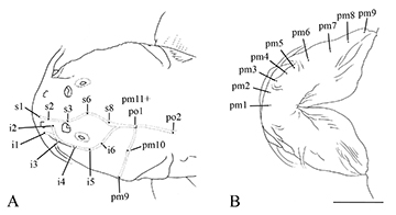 FIGURE 4| Rhyacoglanis varii laterosensory canal pores, MZUSP 54082, 47.6 mm SL, paratype, in dorsal (A) and ventral views (B). i1 to i6 = infraorbital pores 1 to 6; pm1 to pm11 = preoperculomandubular pores 1 to 11; po1 and po2 = postotic pores 1 and 2; s1 to s8 = supraorbital pores 1 to 8. Scale bar = 5 mm.