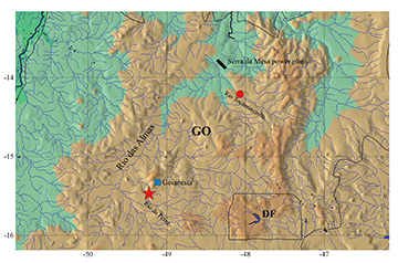 FIGURE 6| Map of Rhyacoglanis varii distribution through upper rio Tocantins basin (red dot = rio Tocantinzinho tributary; red star = type locality, rio do Peixe), state of Goiás (GO), Brazil. DF = Federal District of Brazil.