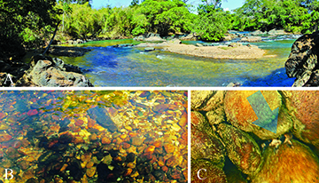 Ecological notes. The type locality in the rio do Peixe presented clear running waters, mostly shallow, with deeper pools approximately knee height. The bottom is predominantly pebbles, with rocks, sand, and organic litter (Figs. 7A,B). The color pattern of the species, yellowish or orange-brown background with alternating dark brown bars, allows for perfect camouflage amid the rocks and litter (Fig. 7C). The area is in a rural and pristine zone, with marginal vegetation well preserved, which is the source of the organic litter. Dissolved oxygen 8.3 mg.L-1, pH 8.06, conductivity 83.4μS.cm-1, and temperature 22.5° C (at 12:54h Brasília time). Specimens were found under rocks, protected from the water current (Fig. 7C), and collected with a sieve with a high-density polyethylene mesh of 2 mm size as rocks were turned. The use of trawls or fishing nets was inefficient for their capture.