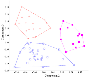FIGURE 8| Second and third principal components axes of combined samples of Rhyacoglanis varii (red cross, n = 16), R. paranensis (blue square; n = 31), and R. rapppydanielae (pink square; n = 13).