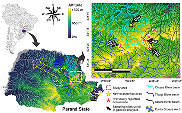 Interestingly, species inventories have also suggested headwater captures enabling exchanges of ichthyofauna between headwaters of Cinzas and Itararé basins (Frota et al., 2020) as well as among headwaters of other rivers throughout the state of Paraná, including the Iguaçu, Piquiri, Ivaí, Ribeira de Iguape and other tributaries of the Paranapanema River basin (Ribeiro, 2006; Frota et al.,2016; Cavalli et al.,2018; Morais-Silva et al.,2018). In all these cases, headwater captures have been associated with intense geological activities and activation of old faults during the Cenozoic, mainly in areas under influences of the Serra da Esperança and the Ponta Grossa Arch (Ribeiro, 2006; Frota et al.,2016). Indeed, although the upper Paraná River basin seems to maintain its main physiography since about 9.0 million years ago (Mya) (Albert, Reis, 2011), several events from the Miocene to the Pleistocene, including marine incursions, climate oscillations (Hubert, Renno, 2006; Carvalho et al., 2016), tectonism (Morais-Silva et al.,2018) and inter- and intra-basin headwater captures (Lundberg et al., 1998; Ribeiro, 2006; Cavalli et al., 2018), had important influences on the diversification of their species and fish populations.