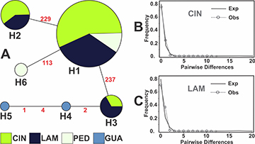 Three haplotypes occurred in CIN and LAM (H1, H2 and H3) and two in GUA and PED (H4 and H5). H1 was the most frequent haplotype, occurring in CIN, LAM and GUA, while three haplotypes (H4, H5, and H6) were singletons (Fig. 2A). No significant values were obtained from Tajima (D) and Fu (Fs) neutrality tests (Tab. 1) and the mismatch distribution graphic showed a unimodal distribution for haplotypes (Figs. 2B–C).