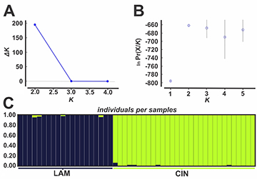 Genetic variation between populations. Considering only CIN and LAM(N ≥ 20), AMOVA results from microsatellite data indicated a large percentage of molecular variation (25.13%) occurred between these populations while mtDNA data showed no variation between samples. The pairwise ΦST, calculated from mtDNA, was not significant (ΦST = -0.027, P-value > 0.05). On the other hand, all population differentiation estimators used on microsatellite data (DEST =0.248, FST = 0.255 and RST = 0.360, P-value < 0.05) showed significant values. Bayesian clustering analysis indicated, from ln Pr(X/K) (Pritchard et al., 2000) and ∆K ad hoc statistics (Evanno et al., 2005), that the most probable K value (cluster number) was K = 2 (Figs. 3A–B). From this result, the graphic representation shows two distinct groups, one formed by CIN and the other by LAM (Fig. 3C).