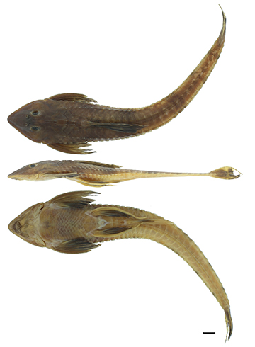 FIGURE 1| Holotype of Loricaria nimairaco, ICN-MHN 24398, 185.8 mm SL, Colombia, Amazonas, Leticia, Amazonas River. Scale bar = 10 mm. Photos: Gabriel Cortés.